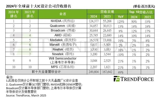 根據TrendForce集邦咨詢公布的數(shù)據,2024年全球前十大IC設計業(yè)者營收合計約 2498億美元,年增49%。